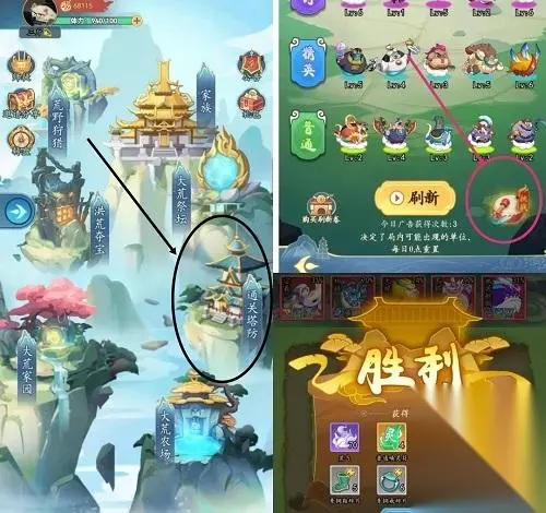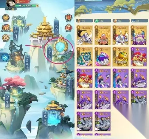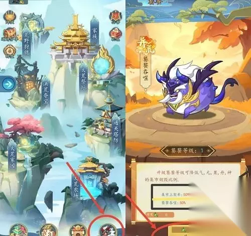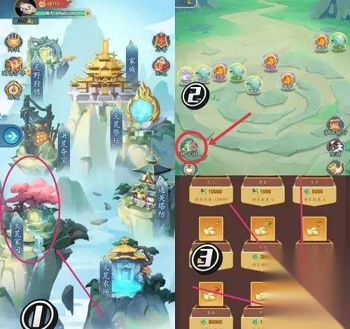 玩家可通过大荒家园中的神话阁进行材料兑换实现快速升级,家园等级越高,掉落材料价值越高。玩家通过购买礼包,家园可直升19级,其余材料在神话阁中进行兑换,直至升到21级,21级产出6级荒元 三、塔防