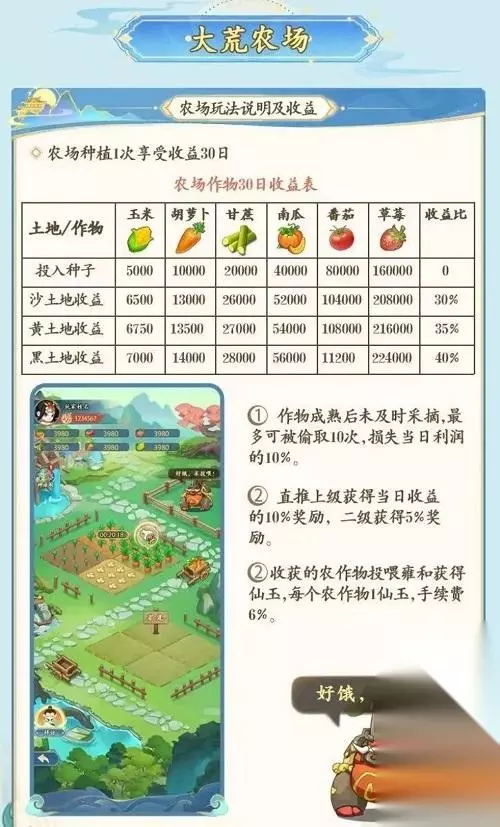 种植一次作物,可享受30天收益。不同作物所需种子投入数量不同,简单来说农场就是矿机 收益比在30—40%。 防偷机制:作物成熟不及时摘,最多被偷10次,损失当日利润10%,促使玩家及时上线。 五、大荒祭坛