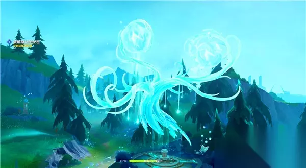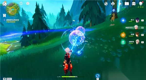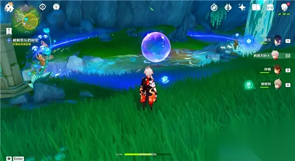 然后,推动这个大水泡,确保它位于三个管琴之间。要注意,水泡周围的紫色圈圈需要正好覆盖住三个琴。此时使用普通攻击打碎水泡,同时激活三个琴,完成解谜。 成功击破泡泡并演奏三个琴,完成第一个谜题的挑战。