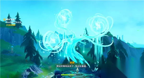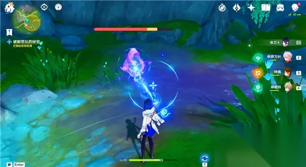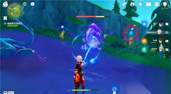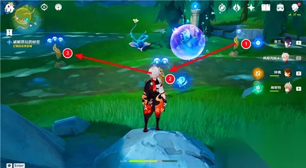 第3个谜题 最后,前往祭坛西北边的瀑布附近,找到第三个谜题。首先,清理周围的丘丘人,然后按住战技键清除紫色物体。