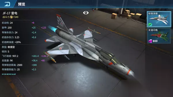 JF-17 雷电 JF-17雷电是一款全天候、单发、单座、多用途轻型战斗机。具有突出的中低空和高亚音速机动作战能力,较好的截击和对地攻击能力,较大的航程、留空时间和作战半径,优良的短距起降特性和较强的武器挂载能力。 解锁条件:1700勋章 飞机类型:敏捷型 购买条件:750钻石 赠送价格:750友谊币 获取方式:商店推送、幸运宝箱抽取 满级属性
