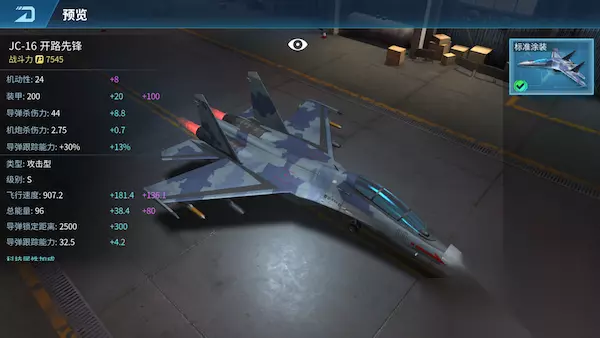 JC-16 开路先锋 JC-16开路先锋是一款双座双发多用途战斗机,装备主动电子扫描相控阵雷达,可同时识别攻击多个目标,具备远距离超视距空战能力和强大的对地、对海打击能力。 飞机类型:攻击型 获取方式:幸运宝箱抽取 满级属性