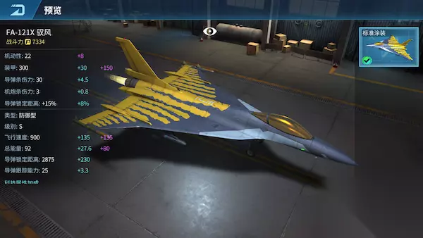 FA-121X 驭风 FA-121X驭风战机采用三角箭形机翼布局,能够保持原有的亚音速飞行性能,还可进一步改进超音速和低速大迎角性能的空间,并更好地兼顾了战机的总体性能。 解锁条件:等级38 飞机类型:防御型 购买条件:64000金币 提前购买:640钻石 满级属性