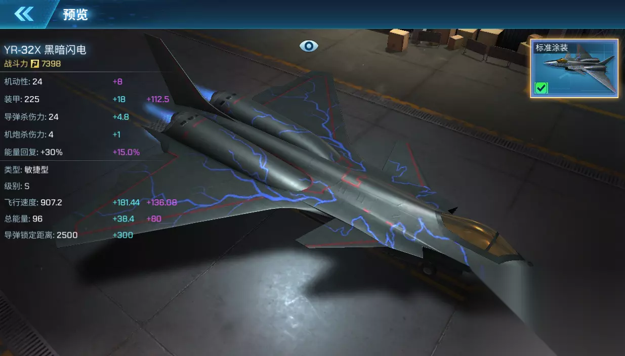 YR-32X 黑暗闪电 YR-32X黑暗闪电拥有独特的机身外形设计,其鸭式三角翼布局和罕见的矩形四发矢量推力的配合使其成为拥有高速性能的敏捷战机。 飞机类型:敏捷型 获取方式:段位达到皇冠以上购买 购买价格:300黑暗能量水晶 满级属性