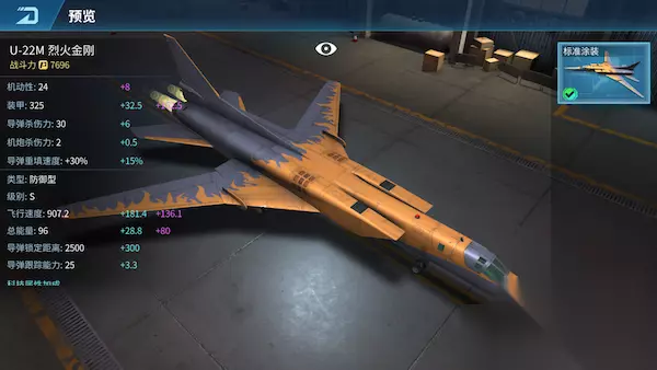 U-22M 烈火金刚 U-22M烈火金刚是一款超音速可变后掠翼长程战略轰炸机。该机具有核打击、常规攻击以及反舰能力,有着良好的低空突防性能。 解锁条件:等级24 飞机类型:防御型 购买条件:750钻石 赠送价格:750友谊币 获取方式:商店推送、幸运宝箱抽取 满级属性