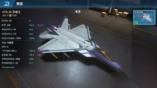 ATD-2X 百兽王 ATD-2X百兽王作为先进技术的验证平台和实际测试飞行的第五代匿踪型战斗机,在架构大体上为双发动机、向量喷嘴、双垂直尾翼的机体。 解锁条件:等级23 飞机类型:均衡型 购买条件:300000金币 赠送价格:1500友谊币 获取方式:商店推送、幸运宝箱抽取 满级属性