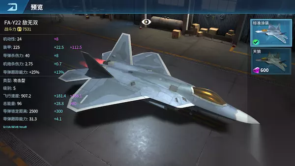 现代空战3D《现代空战3D》战机百科:S级篇如下: FA-Y22 敌无双 FA-Y22敌无双是一种单座双引擎第五代隐形战斗机。其隐身性能、灵敏性、精确度和态势感知能力结合,组合其空对空和空对地作战能力,使得它成为当今世界综合性能最佳的战斗机。 解锁条件:50星章 飞机类型:攻击型 购买条件:78000金币 提前购买:780钻石 满级属性