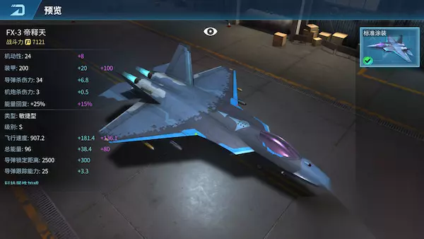 FX-3 帝释天 FX-3帝释天是一种以防空拦截为主,兼顾空中优势、对地攻击的多用途作战飞机。采用菱形机身和V形垂尾,做到了对于隐身和机动性能的兼顾。 解锁条件:1500勋章 飞机类型:敏捷型 购买条件:320钻石 提前购买:480钻石 满级属性
