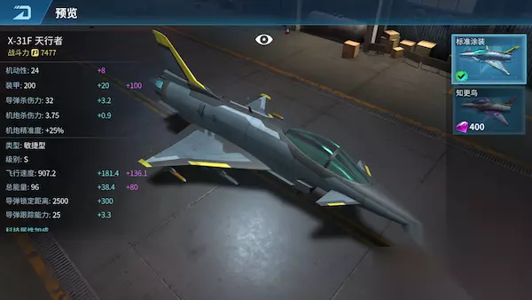 X-31F 天行者 X-31F天行者采用鸭式前翼、机腹进气、双三角机翼、单垂尾、无平尾布局,主要用来验证推力矢量技术与高级飞控系统配合的实用性。 解锁条件:1600勋章 飞机类型:敏捷型 购买条件:600钻石 赠送价格:600友谊币 获取方式:商店推送、幸运宝箱抽 满级属性