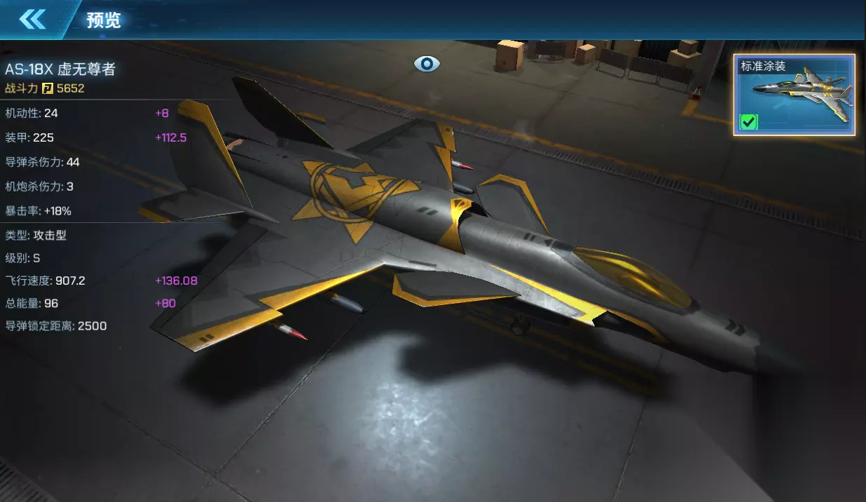 AS-18X 虚无尊者 AS-18X 虚无尊者是一架单发单座攻击型战斗机,采用了鸭翼与内倾双垂尾布局。机翼前面的小翼面称为前翼或鸭翼,前翼可以像水平尾翼那样起着俯仰操纵和平衡的作用;飞机的俯仰操纵由机翼后缘的升降副翼来完成。尾翼与机翼的夹角大于90°,内倾的双垂尾更有利于隐身,极大提高了战机的机动性与隐身性能。 飞机类型:攻击型 获取方式:商店购买 购买价格:300荣誉勋章 满级属性