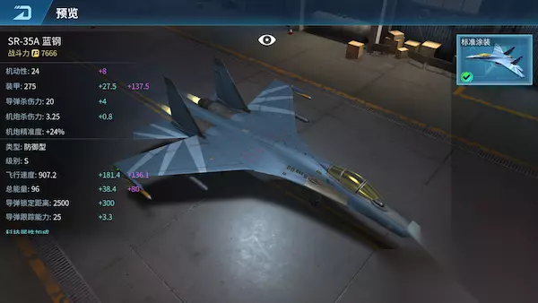 SR-35A蓝钢 SR-35A蓝钢是一种三翼面布局、无攻角限制、全数位飞控四代半重型战机。具有远程,多用途,空优和打击等特性。 飞机类型:防御型 获取方式:幸运宝箱抽取 满级属性