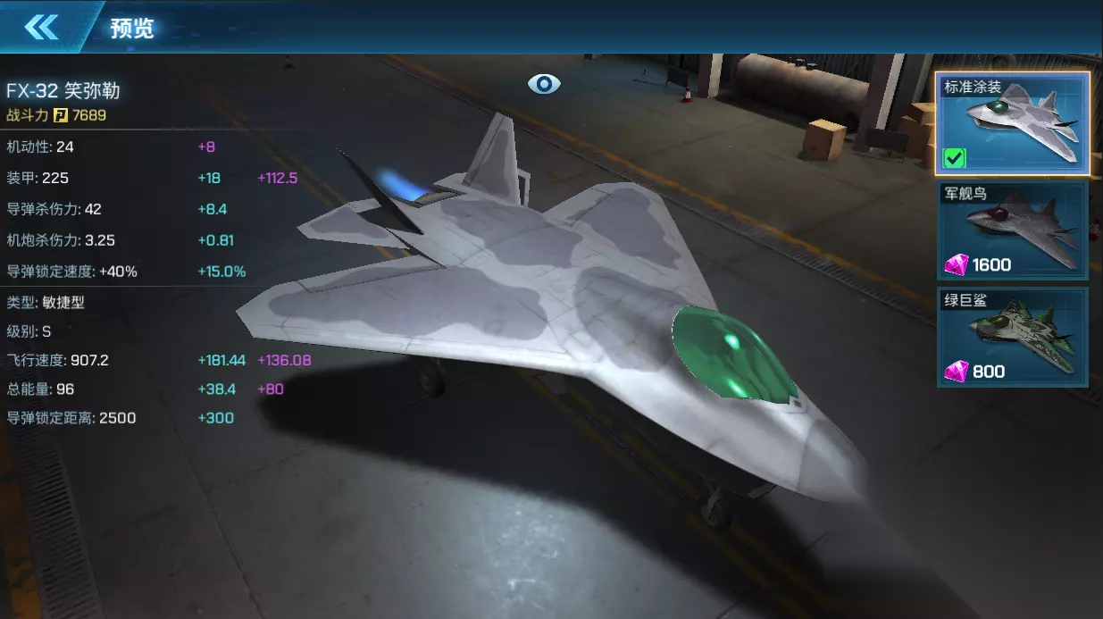 FX-32 笑弥勒 FX-32 笑弥勒采用三角翼、双垂尾布局,外形比较奇特,由于它有一对联接在发动机后部的可转向的喷气升力喷管,因而发动机必须安装在飞机前部。X-32 采用很厚的整体式机翼,可承载大部分的结构载荷,并能装载近 9 吨燃油。机头下方有一个缝式进气口,每秒可吸入 180 千克的空气,供一台普惠 F119--SE614涡轮风扇发动机使用。飞机类型:敏捷型 获取方式:幸运宝箱抽取 满级属性