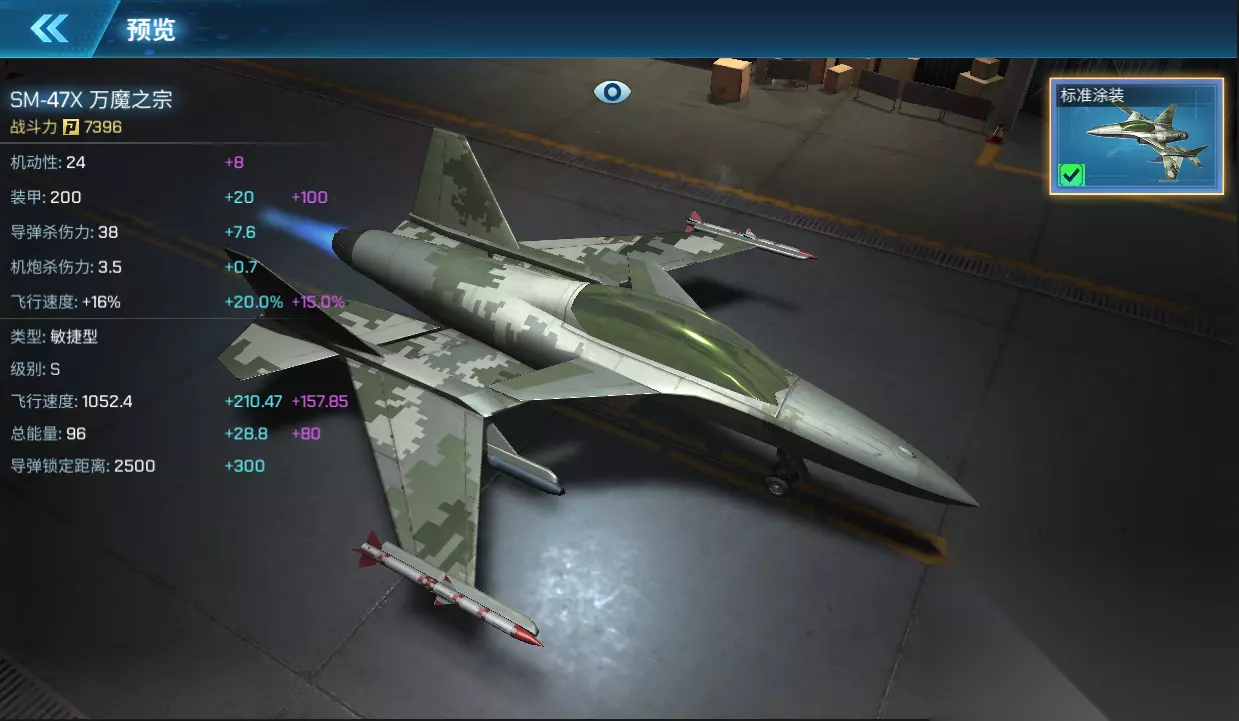 SM-47X 万魔之宗 SM-47X 万魔之宗采用前掠翼,单发双垂尾的布局,前掠翼这种机翼的外形特点是,其前缘和后缘均向前掠,即掠角为锐角。前掠翼是相对后掠翼而言的一种翼型,可使飞机在亚音速飞行时具有非常好的气动性能,从而大大提高其在仰角状态下的机动性。万魔之宗的尾翼与尾喷管呈分离状态,极具科幻外形,具有极高的敏捷能力。 飞机类型:敏捷型 获取方式:战队联赛宝箱抽取 满级属性