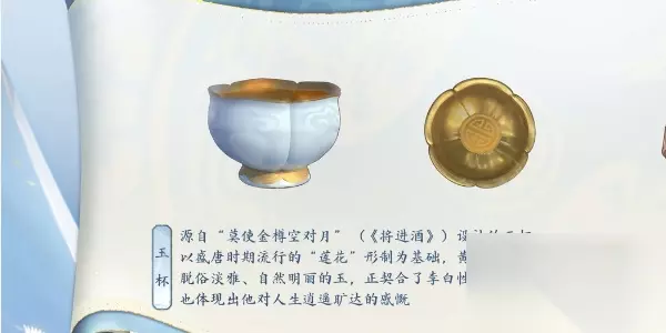 6、玉杯: 源自“莫使金樽空对月”(《将进酒》)设计的玉杯,以盛唐时期流行的“莲花”形制为基础,黄金为底嵌有青玉作为装饰,脱俗淡雅、自然明丽的玉,正契合了李白性格中的开朗磊落,也体现出他对人生逍遥旷达的感慨。