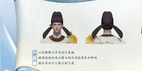 2、幞头: 以软脚幞头作为设计基础,稍硬挺的材质让幞头的外形轮廓更加鲜明,贴合李白文人雅士的气质。
