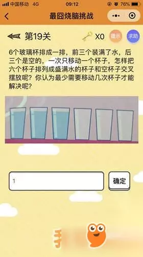正确答案:1次 答案解析:把第二个有水的杯子(即第二个杯子)中的水倒入第二个空杯子(即第五个杯子)中.这样二、四、六是空杯子,一、三、五是有水的杯子。 微信最囧烧脑挑战第20关答案: