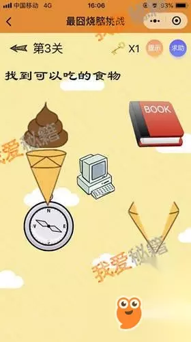 答案:把钻石的中间部分拖到左上角的看起来像是“粑粑”的物品下即可组合成甜筒(作者恶意满满啊....)。 第4关: