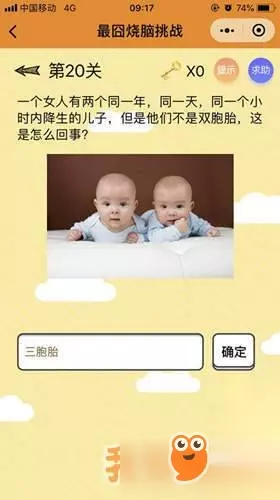 正确答案:三胞胎 答案解析:可能是三胞胎、四胞胎、五胞胎... 微信最囧烧脑挑战第21关答案: