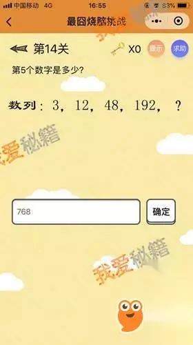 正确答案:768 答案解析:每个数乘以4等于第二个数,所以第5个数就是768。 第15关:
