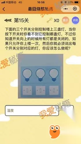 正确答案:温度 答案解析:先开一盏灯,过5分种关掉,在开另外一盏灯,进房间,摸一下另外两盏不亮灯的灯泡,哪个灯泡烫就是你开的第一盏灯,灯泡亮的是你开的第二盏灯。 微信最囧烧脑挑战第17关答案: