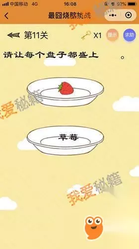 正确答案:把题目中的“草莓”两字移到盘子上即可。 答案解析:题目中没有说是一定要可以吃的草莓啊~是不是被坑了? 第12关: