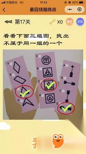 正确答案:点击图一中的C、图2中的C,图三中的D 答案解析:图1都是四边形;图2都有3种几何形状;图3都是5个珠子; 微信最囧烧脑挑战第19关答案: