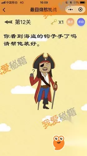 正确答案:题目上的问号就是海盗的钩子手,只要把这个问号拖动到海盗的手上,就通关啦! 答案解析:这道题比较适合小朋友,因为要的是形象~ 第13关: