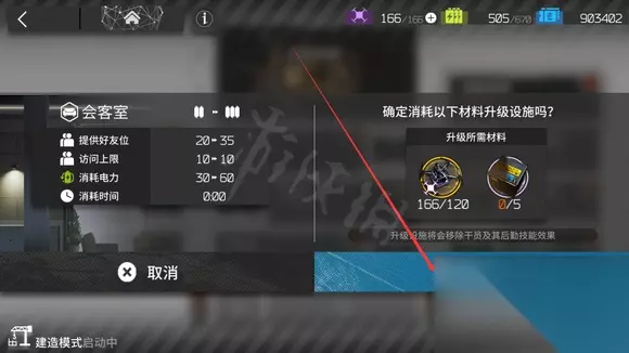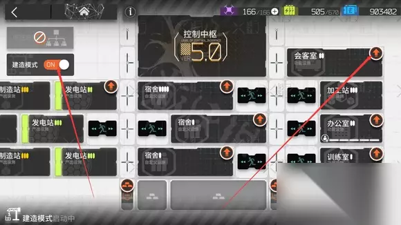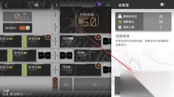 2、开启建筑模式,点击会客室升级图标。
