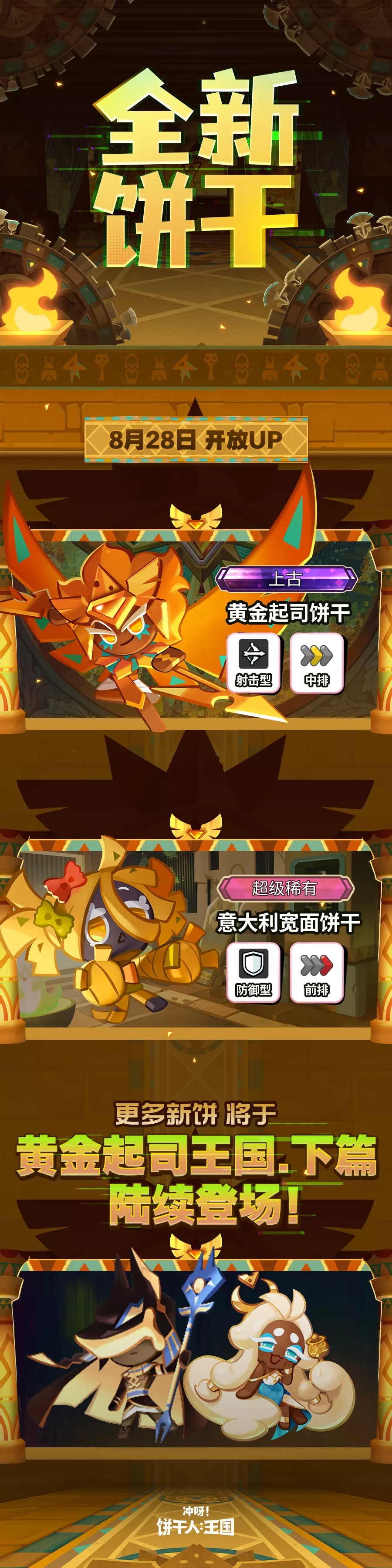 全新版本「黄金起司王国」将于8月28日开启!全新射击型「上古」黄金起司饼干、防御型「超级稀有」意大利宽面饼干实装!