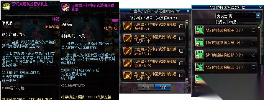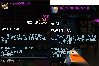 活动时间:2月1日-4月5日 活动内容: 1、12/24表示购买12套和24套春节礼包获得的赠品,购买第12套、第24套时,均可获得1个至尊宠物和1个90史诗防具跨界石;每12套即可获得一次,但是每个帐号仅限获得2次; 2、比如购买第2套、第14套时,均可获得1个梦幻克隆和1个武器袖珍罐; 3、25套之后不循环,固定获得兽人族的特别宝物礼盒【可交易】; 购买第2/14套赠送1个梦幻克隆装扮套装礼盒&远古兽人的神圣武器袖珍罐礼盒