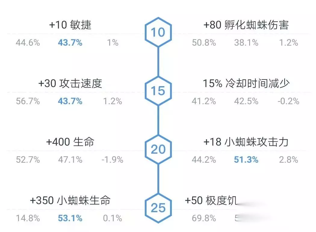 1.纯小蜘蛛流 纯小蜘蛛流,10级选择100伤害,15级选择减cd,20级选择小蜘蛛攻击力,25级选择小蜘蛛血量。这个加法后期可以转虚灵刀大根。如果强行转本体对面爆发不够足的情况下还是可以的。在蓝帐bkb以后以控制装为主,羊刀否决大晕锤都可以。正面能力比较弱,偷酱油一把好手。甚至可以羊对面大哥带小蜘蛛秒掉问题都不大。 2.本体流 本体流是以纯本体为目标,10级选择敏捷,15选择攻速,20级选择400血,25级大招吸血。这个打法突出一个正面能力优秀。正常出装。如果再带个无知小帽,有将近5000血,能打能抗。和bkb斯文硬碰硬不是问题。出到强袭大炮金箍棒以后,开大招只要能a出来,一波团站可能吸收2万的伤害不过分。 3.双修流 双修流我们10级选择敏捷,15级选择攻速,20级选择小蜘蛛攻击力,25级选择小蜘蛛血量。这个打法双修,是现在比较流行的打法。以本体参团打输出,小蜘蛛去偷家。这种打法对操作和局势判断也有一定要求。双修拥有不俗的正面能力,bkb期间基本上是可以秒掉对面一个酱油。相对来说双修现在用的比较广泛。也是得益于15级天赋的30点攻速。以前是20级攻速和小蜘蛛2选1,现在我全都要。值得一提的是双修一定要多带线。保证在打团的时候能让小蜘蛛最起码偷掉一座塔。