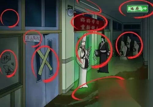 4.点击闪烁的灯管、黑道标志、红色旗帜、黑白无常、鬼魂。 5.点击地上的拖痕和头发,远离陌生人、黄封条、逃生笔记和窗户上的陌生人。