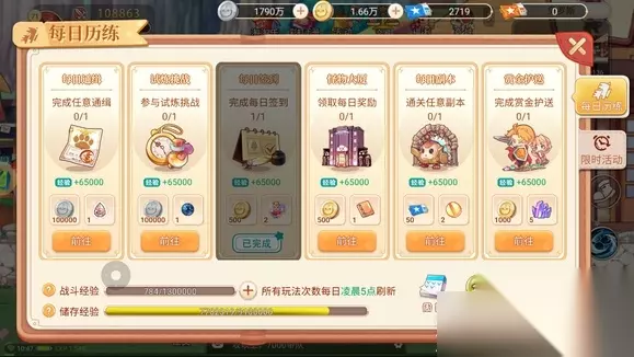 2、在游戏界面的背包旁边,有个玩法,里面一共6种玩法,我建议大家每天都把他完成,因为它们的奖励都非常的实用,还能获得高额的经验,如果没有时间做任务,隔天可以点右下角的“找回”花费一点点绑点就能把头天没做的任务奖励获取。 3、绑点每天在线奖励以及活跃度都可以免费获取。 关于永恒岛之彩虹世界日常刷新时间一览的内容233乐园小编就分享到这里了,希望通过小编的这篇文章,能够解决各位小伙伴的困扰,如果还有其他问题,可以在站内搜索查找哦~有需要的网友可以尝试一下!