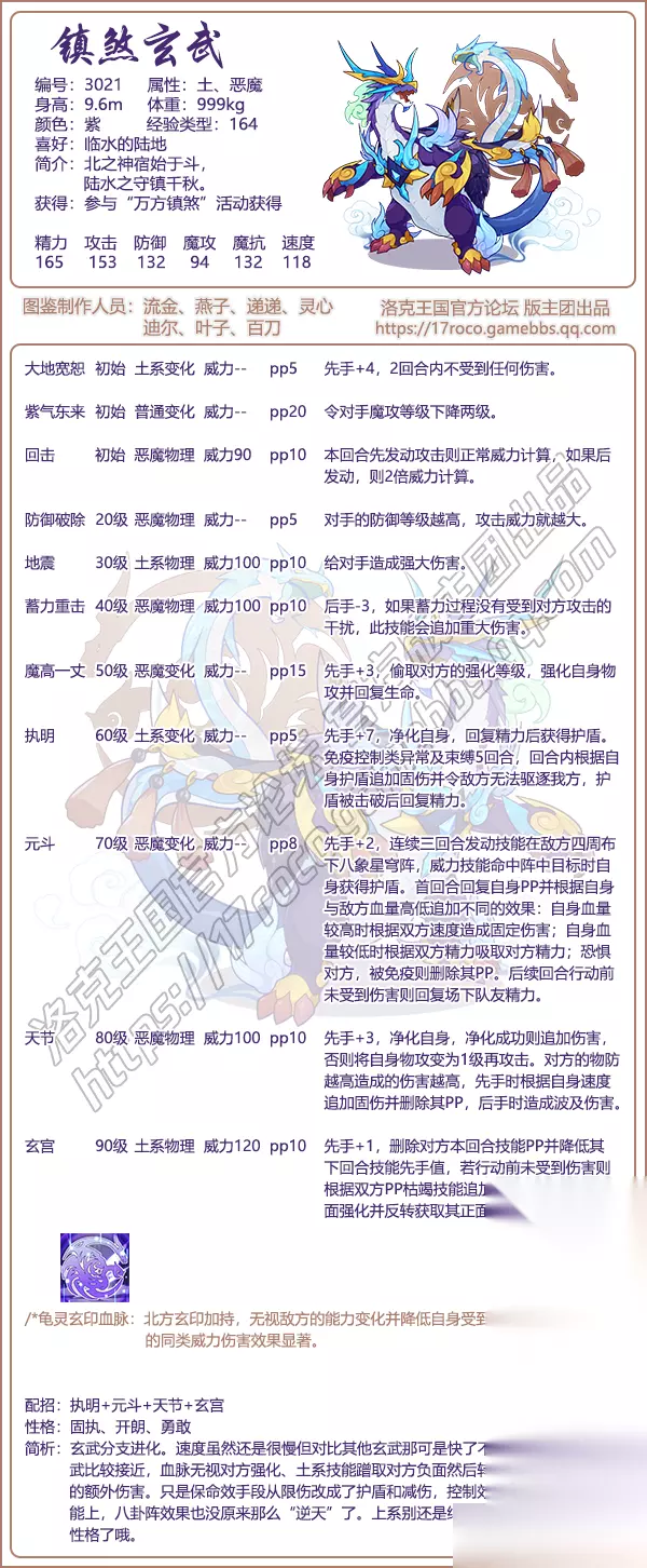 洛克王国镇煞玄武技能表图鉴 镇煞玄武 编号: 3021 属性:土、恶魔 身高: 9.6m 体重: 999kg 颜色:紫 经验类型: 1 64 喜好:临水的陆地 简介:北之神宿始于斗,陆水之守镇千秋。 获得:参与“万方镇煞”活动获得