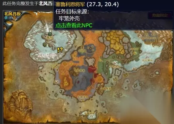 2、做完之后与北风苔原(33.3,34.5)坐标的莱洛拉斯对话触发牢笼任务。 3、触发之后前往(27.3,20.4)坐标的塞鲁利恩将军那里夺取牢笼外壳。