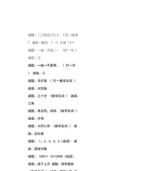 它是一种绿色的叶子,形状像一个心形,人们常用它来象征爱情。答案是:四叶草。 它是一种人工建筑,有着悠久的历史,常常用于纪念伟大的人物或事件。答案是:纪念碑。 它是一种小型昆虫,身体呈黄色,被誉为“勤劳的花粉工”。答案是:蜜蜂。 它是一种储存器件,可以存储大量的数据和文件,随着科技的发展,它的存储容量越来越大。答案是:硬盘。 它是一种被广泛使用的语言,有着丰富的语法和词汇,能够让人们进行交流和沟通。答案是:英语。 它是一种有机化合物,常常用于医学领域,能够起到缓解疼痛和舒缓情绪的作用。答案是:阿司匹林。 它是一种冷饮料,起源于美国,有着多种口味和颜色,被誉为夏日消暑的良品。答案是:可乐。 它是一种运动,被视为奥林匹克运动会的重要项目之一,需要运动员具备高超的技巧和体力。答案是:田径。 它是一种乐器,有着圆形的共鸣箱和六根弦,能够发出悦耳的音乐。答案是:吉他。 它是一种动物,有着强壮的体魄和锋利的爪子,常常被人们用来象征勇气和力量。答案是:狮子。 疯狂猜谜语不仅可以锻炼我们的智力和思维能力,更可以增进人与人之间的交流和互动。希望大家在玩游戏的同时,也能收获知识和快乐!