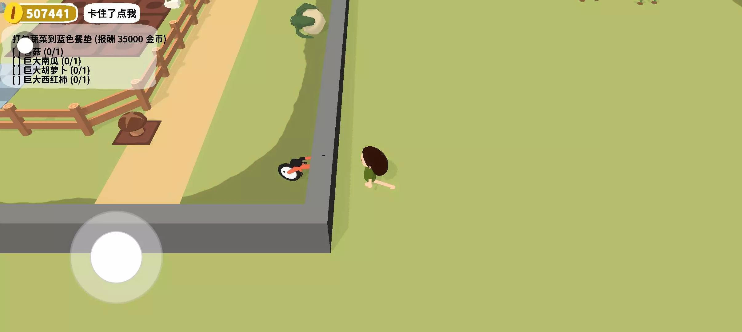 把红色自行车骑到墙边,点击下车就可以出墙。墙外有一个钥匙,把它放在墙边,点击‘卡住了点我’回到墙内,靠近放钥匙的那边墙可以拾取。钥匙能打开宝箱,开出的宝石在菜园门口边的出售蔬菜的箱子可以卖,能挣很多。
