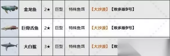 剑星巨型鱼位置 鱼饵:特殊鱼饵 推荐地点:大沙漠·绿洲