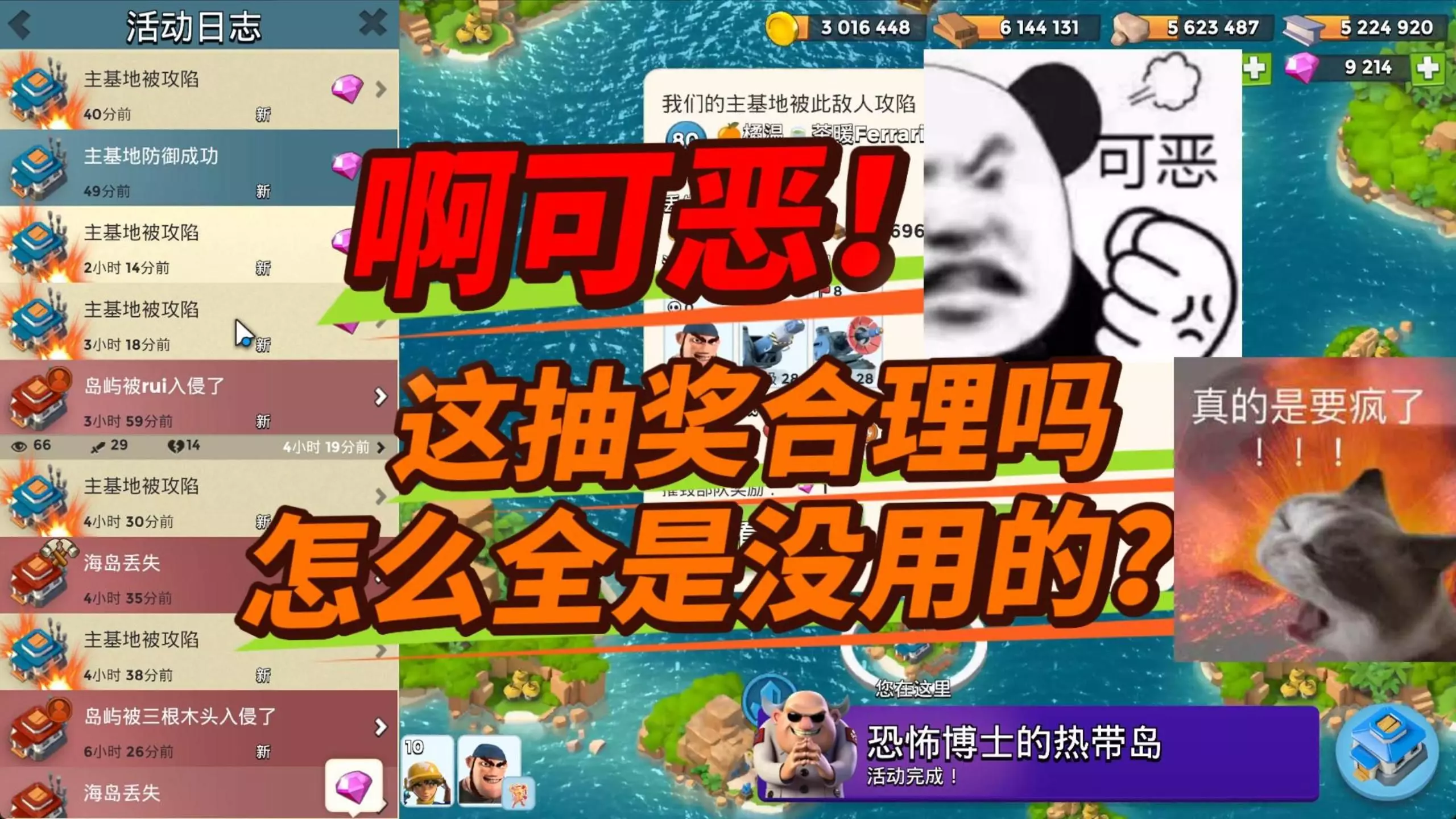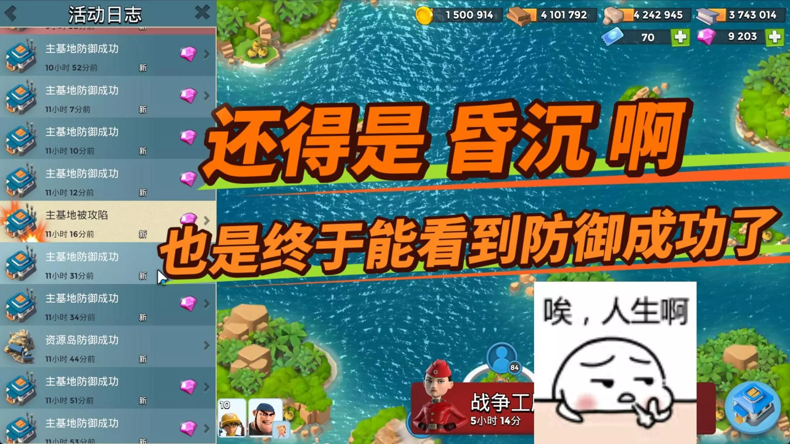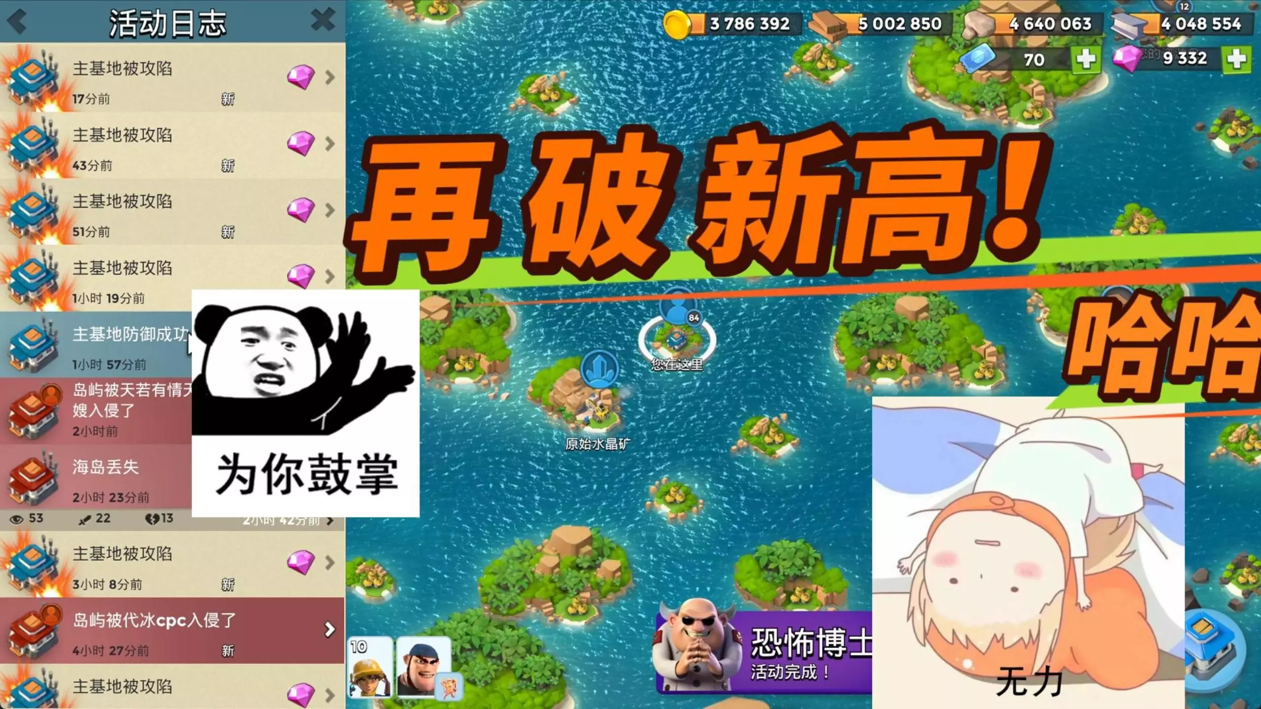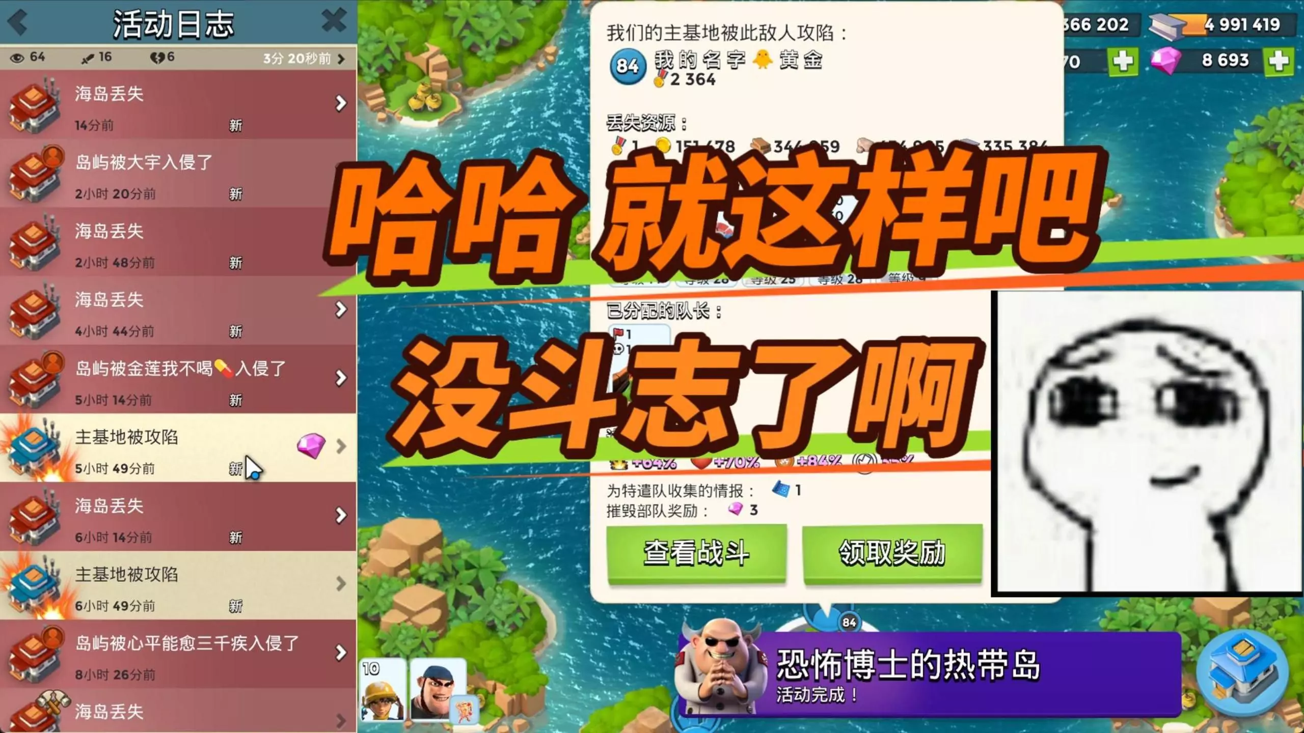 这是手游《海岛奇兵》的冲杯情报帖,展示了玩家的海岛战斗画面,还有基地攻防的活动日志,玩家表示当前冲杯阶段逐渐平静,猜测这是大战前的平静。
