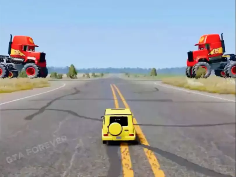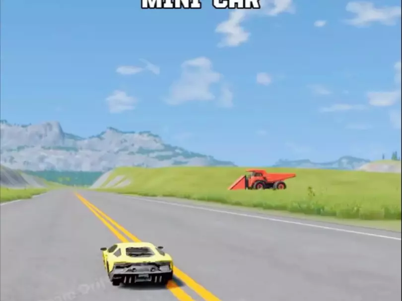 这是VR车祸模拟器的游戏内容,展示了普通车、未来车、小车、迷你车等不同车型尝试飞越大坑的过程,部分车型失败损毁,该游戏可在steam及手机端体验。