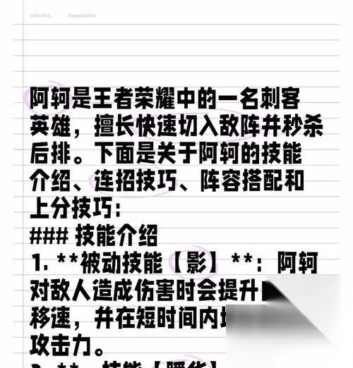 一、技能升级:暗器之影的新变化 二、技能升级:破甲之箭的新功能介绍 三、技能升级:无影之步新加入的潜行状态 四、属性升级:改动后的初始属性值介绍 五、属性升级:改动后的技能成长属性值介绍 六、属性升级:改动后的攻防属性值介绍 七、玩法升级:新加入的增益道具暗器 八、玩法升级:新加入的自动攻击模式介绍 九、玩法升级:新加入的隐匿被动技能介绍 十、游戏模式升级:新加入的无限乱斗模式介绍 十一、游戏模式升级:新加入的约战模式介绍 十二、游戏模式升级:新加入的对局记录查看功能介绍 十三、英雄搭配升级:荆轲新的合适队友介绍 十四、英雄搭配升级:荆轲新的压制对象介绍 十五、策略指南升级:荆轲新的作战策略介绍 通过这次大调整,荆轲在技能、属性和玩法等方面得到了全面升级,为我们在游戏中的使用和策略提供了更多更好的选择和思考。希望大家可以根据这些改动,进一步提高自己在游戏中的技术和策略水平。 《王者荣耀》游戏新版本荆轲调整详解 《王者荣耀》是一款备受欢迎的手机游戏,荆轲是其中一个非常受欢迎的英雄角色。最近,《王者荣耀》推出了新版本,并对荆轲进行了一些调整。接下来,本文将为您详细介绍这次荆轲的调整内容。 荆轲的技能介绍 1.原本技能的描述 在介绍新版本荆轲的调整之前,我们先来了解一下荆轲的技能。