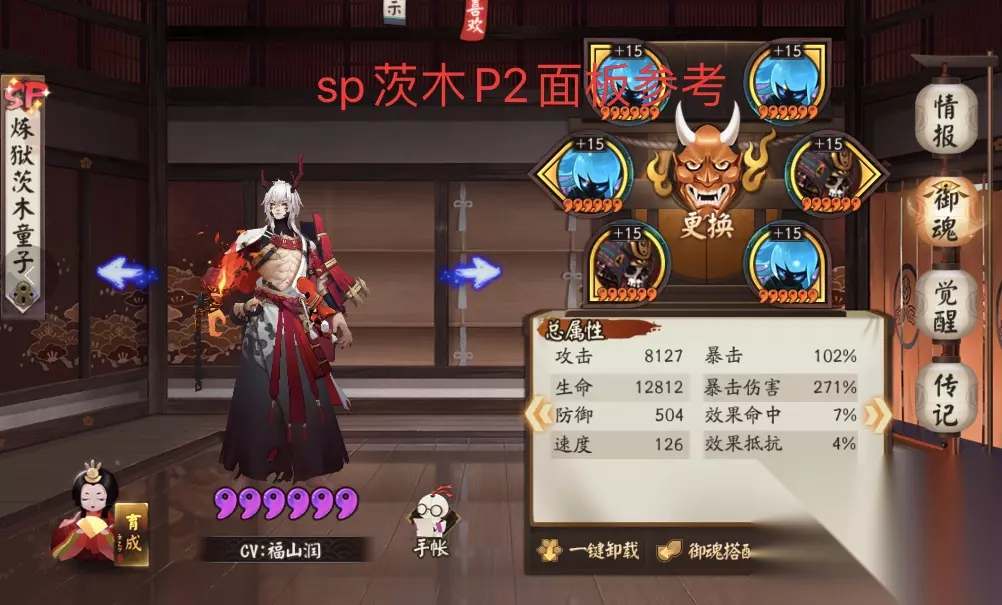 P2速通阵容 在P1的配置为饭笥阵容的前提下,我们再来配置P2阶段的阵容,这里先给大家推荐最快的一套,具体配置为一速玉藻前,带阴摩罗速攻暴,满暴,速度需要大于215,注意不能满三技能,并且要带传记四的姿度;二速阴阳师晴明,技能锁星;三速炼狱茨木童子,带破势+荒骷髅攻攻爆,面板在2.1以上即可;因幡辉夜姬,带散件暴伤,御魂计算效果指标暴伤,速度沉底即可;不见岳,带散件防防防,御魂计算效果指标防御,速度沉底;不知火,带火灵四件套即可,不要堆速度。