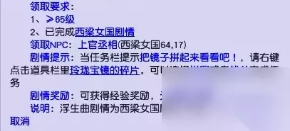 梦幻西游西梁女国浮生曲剧情奖励有什么 1、剧情奖励全为经验值,没有剧情点奖励和银两奖励。 2、需要玩家≥65级且完成西梁女国剧情后才能够接取。