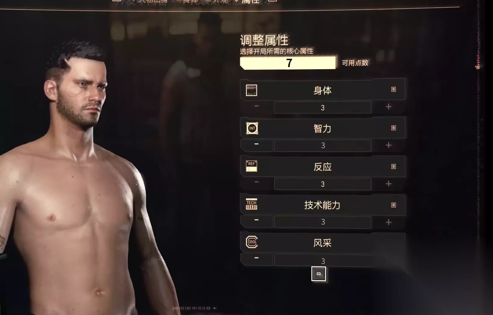 3、在《赛博朋克2077》中,角色的性别是由声音决定的,而不是外表。即使你选择了一个男性肉体并捏出了超级猛男的形象,如果你使用的是女性声带,这个角色仍会被视为女性。 4、在捏脸完成后,你可以开始自定义角色的属性值,这类似于《辐射》中的SPECIAL系统。
