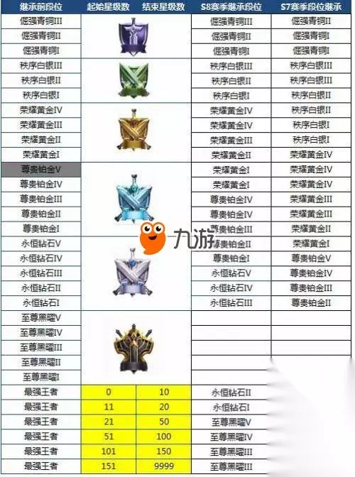 此段位分为V-I ,每小段需要五颗星升段。但低段位升小段的星数有所减少,白银3颗星就能升段,铂金四颗星就能升段。 另外,段位继承规则有所调整。若在本赛季打到铂金Ⅴ,在S7会继承黄金Ⅳ,但在S8会继承黄金Ⅰ。此外,若一个赛季都未打过一场排位赛,那么下赛季将会降为青铜三。