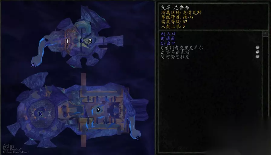 艾卓-尼鲁布,又名蜘蛛王国,是蜘蛛般的蛛魔在诺森德冰封大陆下构筑的地下王国。艾卓-尼鲁布的入口位于龙骨荒野的纳尔苏深渊。在天灾军团毁灭这个王国之前,艾卓-尼鲁布巨大的图书馆中拥有海量的文学、哲学、历史文献。 普通难度等级规定:70 推荐等级:72-74 寻求组队等级规定:70 地点:龙骨荒野 BOSS:看门者克里克希尔、哈多诺克斯、阿努巴拉克 小怪:进入副本后,会看到巡逻的蜘蛛怪,清理掉之后,就看到了1号BOSS和他面前的3波小守卫。一旦战斗开始,那么另外两组没有被激活的守卫,以及BOSS,都会在一定的时间内,按顺序自动开始攻击(信号是BOSS喊出来。如果手动拉一波怪物,BOSS又叫出来,那么另一波就来了,一定要小心)。如果在此灭团,3波守卫会重新刷新。所以这里对于DPS的规定相对比较高。 走过通道,来到BOSS面前会看到三波守卫分别由三只有名字的看守者和两只小蜘蛛组成。在小蜘蛛中,有一种叫战斗机的近战怪物,威胁更大。他会盯着离它最远的人,无视仇恨/免疫嘲讽,所以这个怪物应该先杀。除了常用技能,疾病,蛛网缠绕,三个看守者各有一技之长。右侧纳尔伊:可以被打断的读条技能群体致盲,持续5秒。中间的看守者加什拉:被激怒,攻击速度急剧增加,凝神射击和同类技能可以解除。左面的看守者希尔希克:毒液喷射群体AOE,可解除。 BOSS血量:34.5万。 主要技能:精神鞭笞:大概4000一跳。只对坦克使用;疲劳诅咒:对近战目标造成伤害,降低攻击速度/施法速度,持续10秒。召唤小虫:BOSS定期间隔会召唤大量低血小虫。10%血量后会激怒。 推荐战术:这场战斗的难点在于前面3波小怪的处理。触发任何一波守卫都会开始战斗,直到BOSS被触发。可以先从左右两边挑一边开始拉,优先干掉争斗者,然后解决看守者和另一只小蜘蛛。如果DPS够用,直接等下一波怪物自动来,避免BOSS提前出来,一次两波。三波守卫被杀掉之后,BOSS自己就会过来进入战斗。BOSS本身其实很简单,如果战斗操作中被小虫缠住立即朝T跑去或者让AOE职业直接A掉就好了,其余时间是个木桩战。 成就:[看着他死]:在3只守卫依旧存活的情况下,击杀克里克希尔。 成就推荐战术:按照这个战术,最好有一个能在队内做2T或者干脆组两个T的(DK或者野德)。另外最好有2-3个打断或者眩晕,一个职业控制亡灵。拉小怪的顺序是:由左至右先开左侧第一波,MT拉两只小的,2T拉住看守者,2波过后,MT直接开BOSS,2T拉住剩下的最右侧一波,这时候要注意右侧这波会致盲,控制亡灵的职业控制住其中的争斗者以免其产生麻烦,然后全力DPSBOSS,如果有英勇/嗜血更好。这期间,所有能打断的职业都要注意会致盲的看守者,我们第一时间打断群体致盲,这个技能很恶心一旦被致盲意味着失败,一旦打断失败,那PVP徽章或者人类的种族天赋可以有影响力对这个技能。如果T和治疗的装备够强力,也可以不带2T直接由MT全部拉住,危险的时候注意盾墙。 其他战术1:这个战术的核心要点就是有一个穿工程火箭靴的腿长职业比如法师或者猎人、骑士,直接使用无敌、冰箱或者保护之类的开怪,获得仇恨之后立即向后开启火箭靴跑到通道进行风筝,其他4人快速击杀BOSS。按推荐战术的话,如果2T有火箭靴,可以在大家开始BOSS战的时候风筝掉小怪,减少治疗压力。