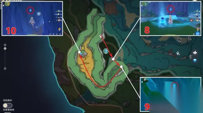 (8)借助水种子,激活晶体就会出现道路 (9/10)这两个神瞳在做这个解密时,可以顺便获得,未完成的小伙伴可以点击下方链接查看详情↓↓↓ 枫丹4.1版本的隐藏世界任务「打破时间墙」流程攻略 4.海域南部(共4个)