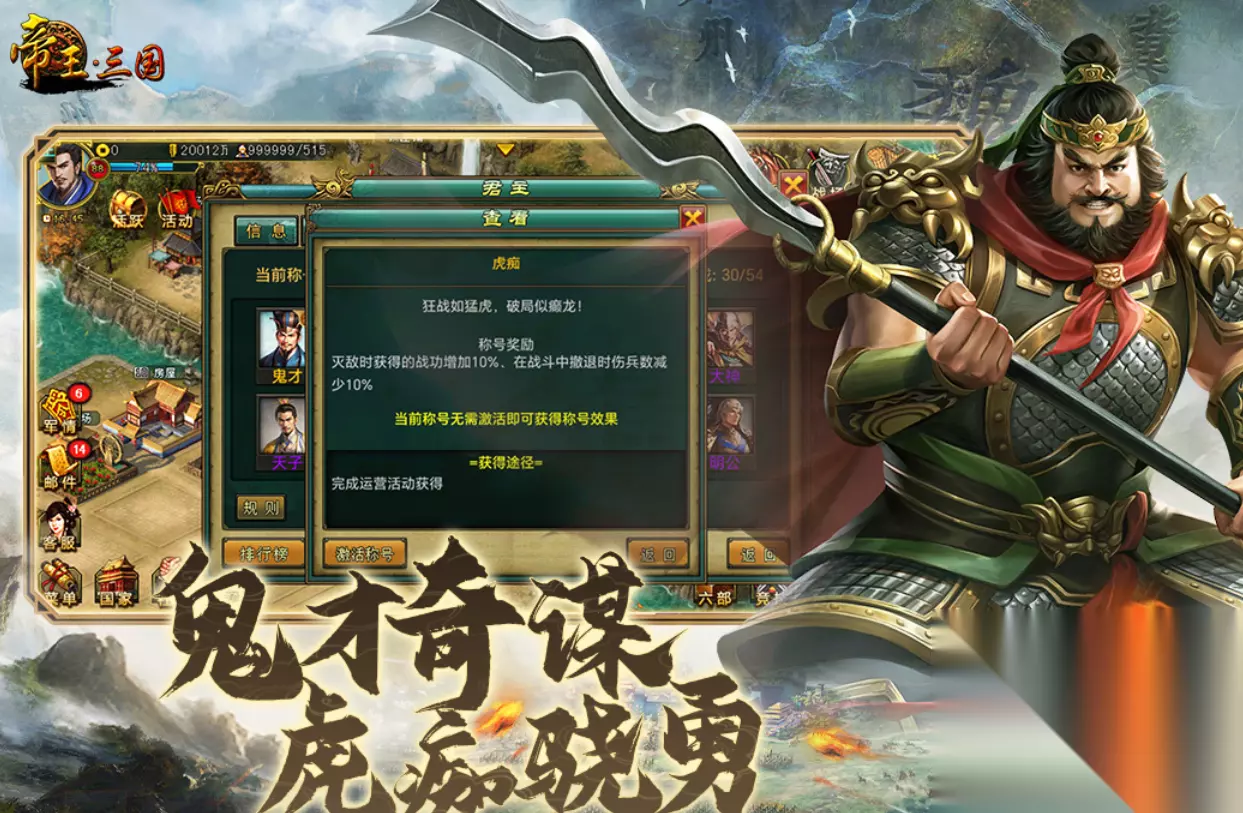 《三国望神州》融合水墨国风美术与回合制战棋机制,地图场景采用手绘质感背景叠加动态天气系统,强化历史氛围营造。主线剧情打破传统时间线束缚,在尊重基本史实前提下拓展人物动机与阵营关系。战斗环节强调站位预判与技能释放时机,每场遭遇战均需结合敌方布阵动态调整己方阵型,策略反馈直观且富有层次感。 扫码下载该游戏 高速下载 普通下载 优先233乐园APP下载 5、《帝王·三国》