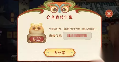 2、然后能够看到自己的集市代码,将自己的集市代码分享给好友,邀请她来你的集市出售小虎糕还能够获得额外的奖励