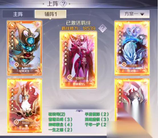 辅阵推荐:苗疆蛊女+转轮大王+息云+息风+玄武兽。同样是看重它的2.5%伤害减免与双生命。